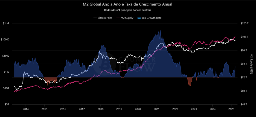 O gráfico do M2 global (dinheiro novo sendo impresso) é o indicador da oferta monetária no mundo. Ele está crescendo nos últimos meses. Historicamente, o Bitcoin acompanha a mesma tendência com até 90 dias de atraso.